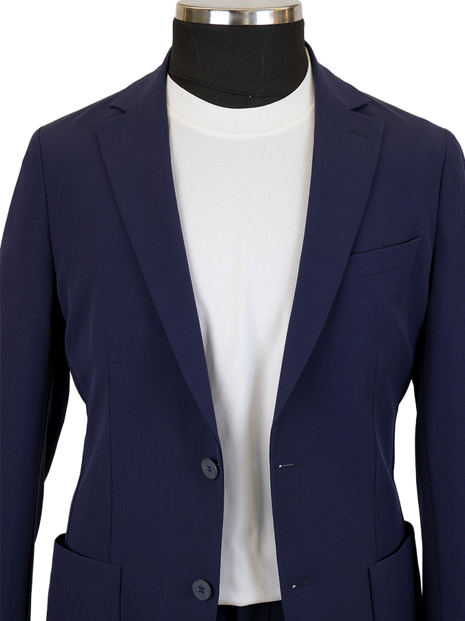 Lacivert zeminde ince çizgili kumaşı ve kruvaze çift düğmeli kesimiyle bu takım elbise, di..